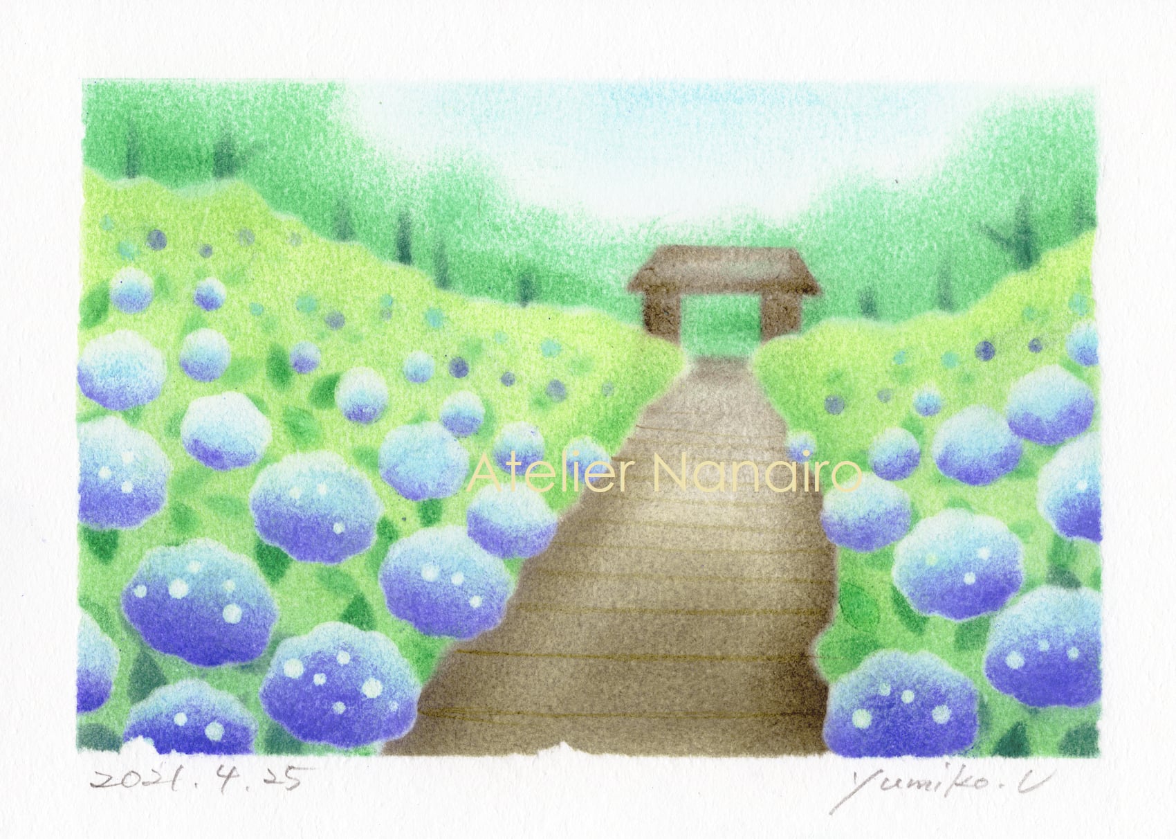 山寺へと続く小径に、見渡す限りの青い紫陽花が咲き誇る、爽やかな風景画です。